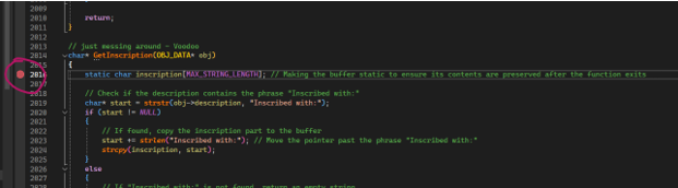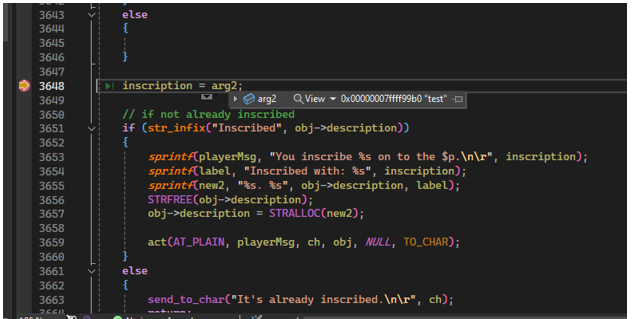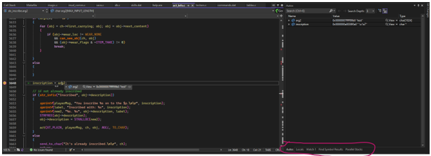 - Back to your immortal - run the command that has the breakpoint set (i.e "look") or in my case "inscribe" and your game will 'break' at the breakpoint so you can see what's going on in the code