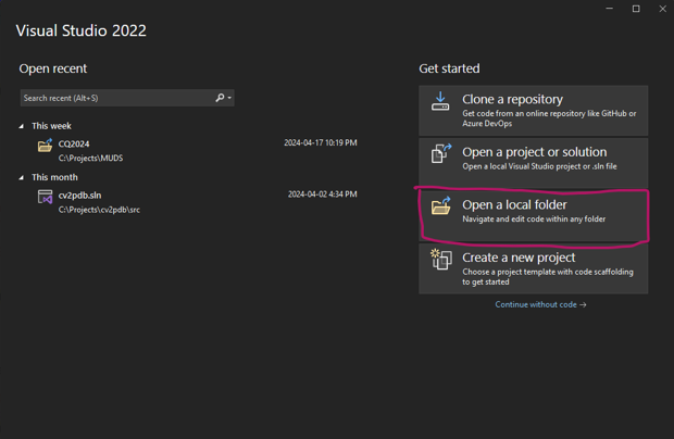 - Open visual studio and select the "open a local folder" option - select the SRC folder on your local hard drive