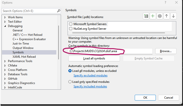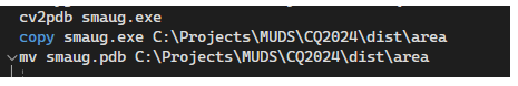 - In your startup script - run the cv2pdb on your .exe and then mv the .pdb file it creates into the /area folder (again, smaug specific? but wherever the exe lives is where the .pdb should live)