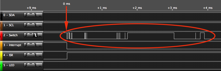 You can also see another batch of switch bounces, circled. That switch certainly had a field day of it. That's 100 ms (1/10 of a second) after it was pressed! In fact, it looks like the second lot of bounces was when I released the switch. That would be right, because when it was released it would have jittered back and forwards a bit until settling down.
