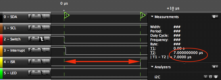 Now, zooming in on the exact moment, we can see how long the interrupt took to fire: