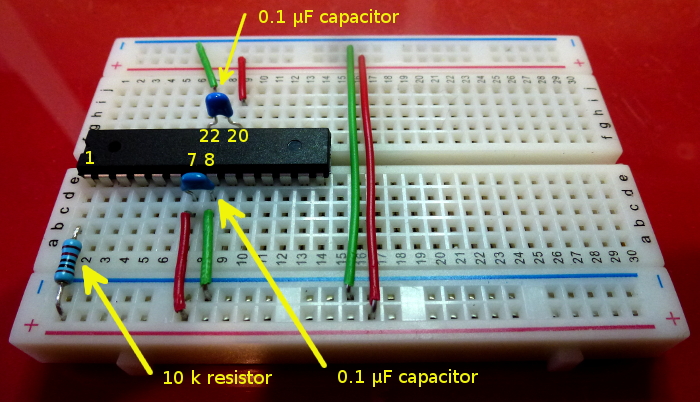 - Connect /RESET (pin 1) to +5V via a 10 k pull-up resistor