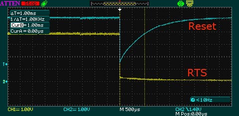 Pin 6 (RTS) To Reset via 0.1 uF capacitor (green)