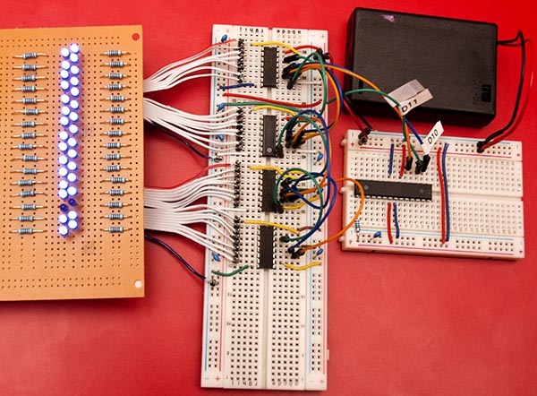 This photo shows the breadboard processor driving another breadboard with 4 x 74HC595 shift registers driving 32 LEDs, as described here: