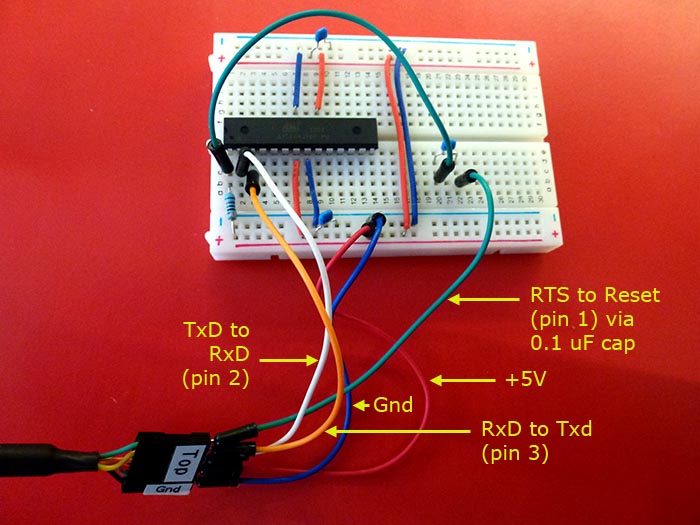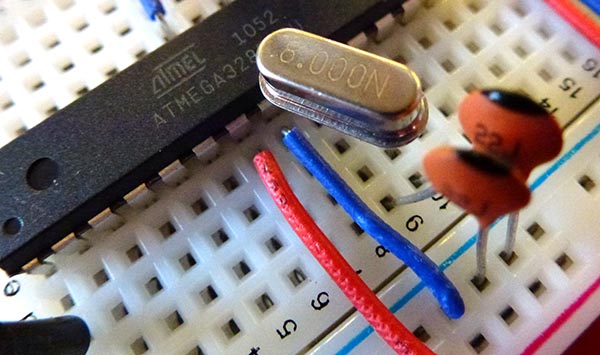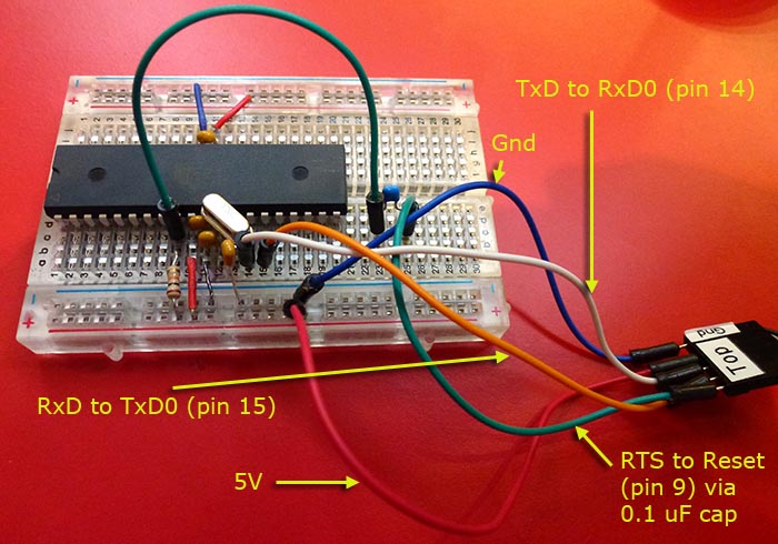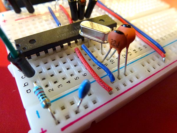 Now the chip has a bootloader, and you can disconnect the power (USB cable) and remove the crystal or resonator.