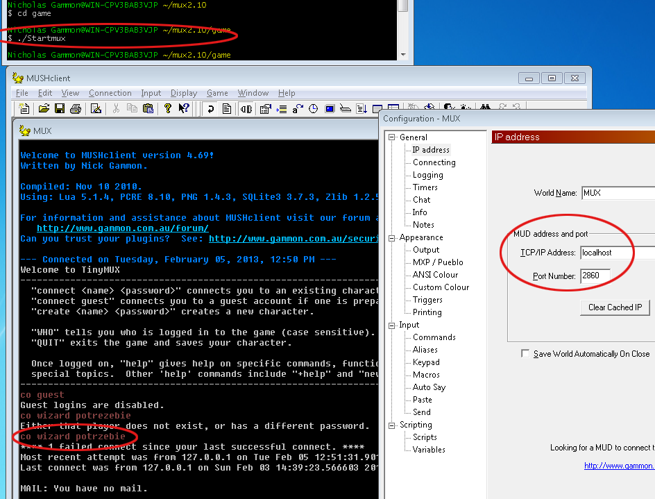 | | Yeah, I have that entered into Cygwin right now and is, I guess, running currently, and opened my MUSHclient second and attempted to connect with the localhost and default port. It's acting like it doesn't exist. | | Top |