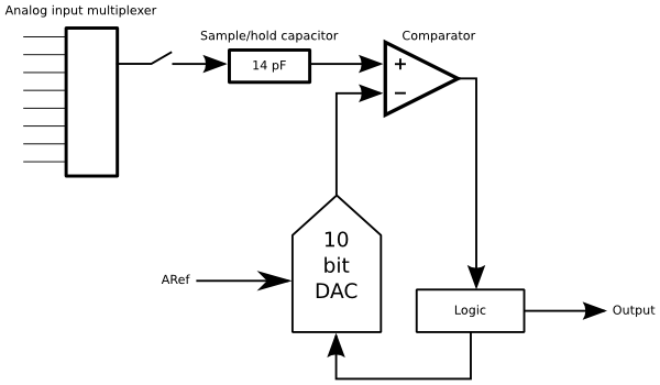 To work out the voltage the logic applies the analog reference voltage (ARef) divided down by a DAC (digital-to-analog converter) under the control of the ADC logic. The output of the DAC is sent to the comparator which determines if the input voltage is higher or lower than the reference voltage, at its current divided state. For example, the high-order bit would be set or cleared by setting the DAC to divide the reference voltage by 2 (ie. 2.5V if ARef is 5V). If the input is higher than 2.5V then the high-order bit in the result is set. This takes one ADC cycle (8 µs at the default prescaler of 128 with a 16 MHz processor clock).