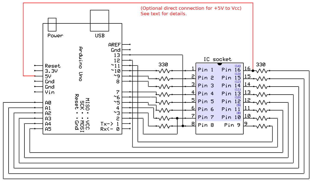 If the code detects that the Ground pin in the truth table is pin 7 or pin 8 then it sets the appropriate Arduino pins to OUTPUT and LOW, thus providing a proper ground. You could conceivably also bypass the 330Ω resistor for the Vcc pin by running a hookup wire directly from the Arduino 5V pin to the Vcc pin of the chip (usually the last pin, the one opposite pin 1, being either pin 14 or pin 16 depending on the size of the chip) — see next section below for more details.