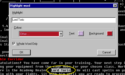 | Well, it might be most useful to have the 'other color' state initially reflect what the colors are in the original hilighted text. Also, in the same vain, an option for, "Match only if the same color as hilighted.', might be nice, since you may only want it to match in specific blocks of text that have a certain predetermined color. Selecting the option would show two more color selectors, which also default to the 'current' color of the word you hilighted. Then you could change it if, for example, the text you hilighted was in one color, but you wanted to look for it in a room, which is a different one. In this case though, the options need to allow for the existing ansi colors as named items you can pick in the color picker for it. While the custom colors are useful, they may not reflect the 'real' colors you are looking for from the mud.